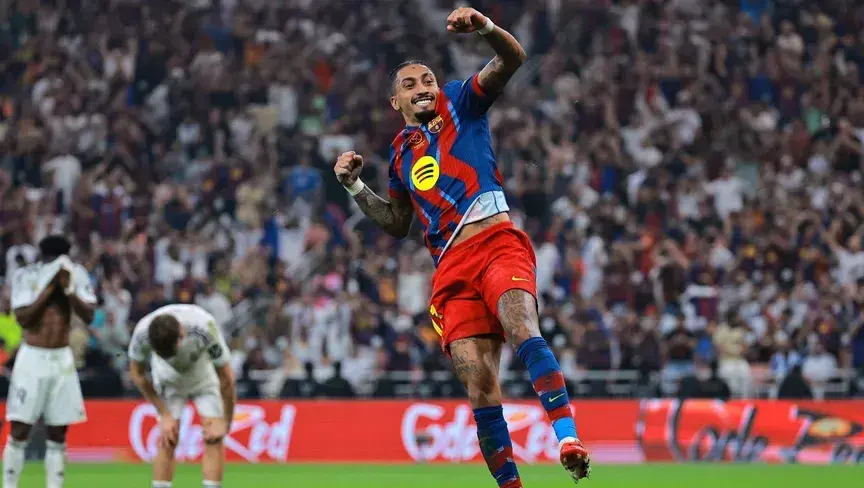 سجل رافينيا هدفين ليقود برشلونة لفوز مثير 3-2 على ريال مدريد، والتتويج بكأس السوبر الإسباني في السعودية اليوم الأحد.