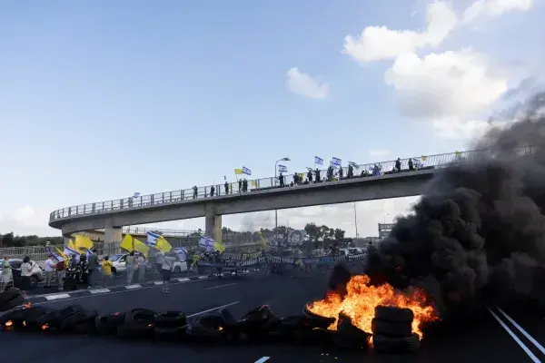 وأضرم المشاركون النار في إطارات السيارات لإغلاق الطرق، رافعين صور المحتجزين ولافتات عليها شعارات تطالب بإنهاء الحرب.