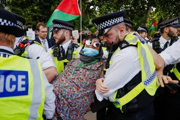 احتجزت الشرطة البريطانية عشرات المحتجين اليوم السبت بموجب قوانين مكافحة الإرهاب لتظاهرهم دعما لحركة فلسطين أكشن، وهي جماعة مؤيدة للفلسطينيين حظرتها الحكومة باعتبارها منظمة إرهابية.