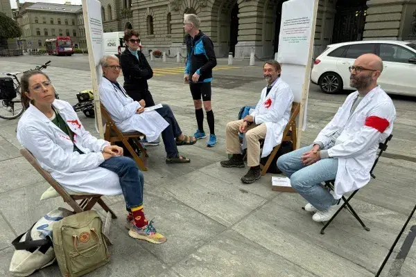 وقال البروفيسور بيترو ماجنو-هورست، الجراح والعضو في جمعية العاملين في الرعاية الصحية السويسرية ضد الإبادة الجماعية: "كان المعطف الأبيض يحميك، واليوم، إذا أردت إنقاذ حياتك، عليك خلعه، وهذا غير مقبول، ومن غير المقبول أننا لا نتفاعل مع ذلك".