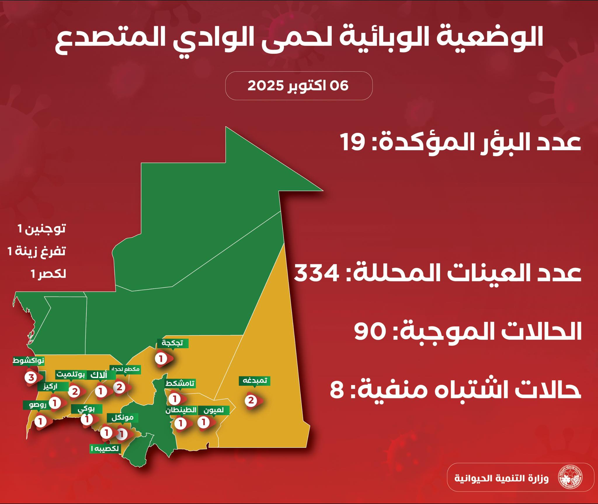 وقالت وزارة التنمية الحيوانية في بيان، إن موريتانيا تواجه حاليا موجة من وباء حمى الوادي المتصدع "حيث سجلت أول بؤرة للمرض يوم 15سبتمبر 2025 في قرية الشام التابعة لبلدية دار البركه في مقاطعة بوكى ولاية لبراكنة، ثم سجلت المصالح البيطرية، حتى يوم 5 اكتوبر 2025، ما مجموعه 19 بؤرة موزعة على 16 مقاطعة، تتبع لثمان ولايات.
