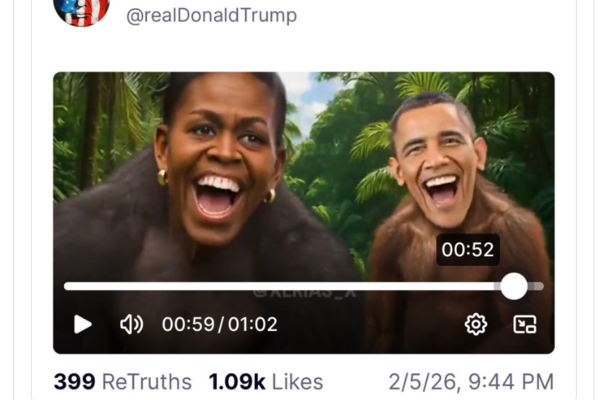 شارك الرئيس الأميركي دونالد ترمب مقطع فيديو على وسائل التواصل الاجتماعي يصور الرئيس الديمقراطي الأسبق باراك أوباما وزوجته ميشيل أوباما على هيئة قردين، مستخدما صورا عنصرية لطالما استُخدمت لتجريد ذوي الأصول الأفريقية من إنسانيتهم.