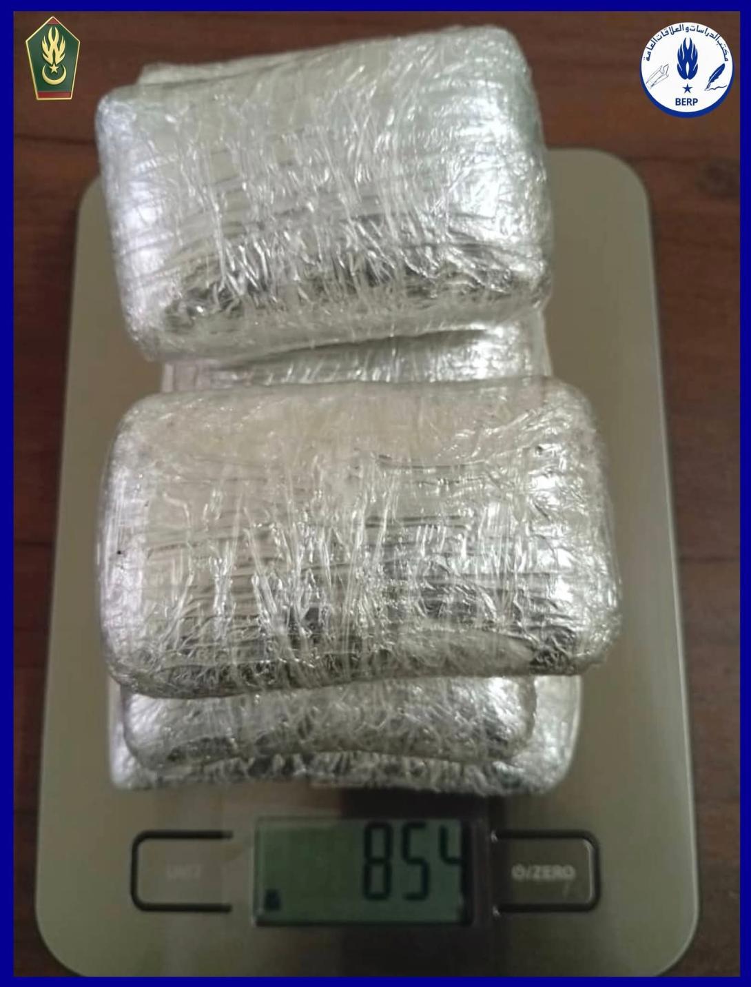 وأوضح الدرك في بيان نشره أن الكمية كانت ملصوقة بإحكام تحت ملابس النسافر ويلفها بقماش مطاطي.