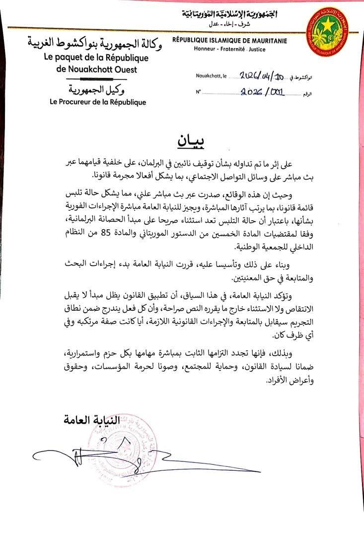 جاء ذلك عبر بيان أصدرته مساء امس بينت خلاله أن الوقائع جرت في بث مباشر علني، ما يشكل حالة تلبس وفق القانون، ويتيح لها مباشرة الإجراءات الفورية رغم الحصانة البرلمانية، استنادا إلى المادة 50 من الدستور الموريتاني والمادة 85 من النظام الداخلي للجمعية الوطنية.