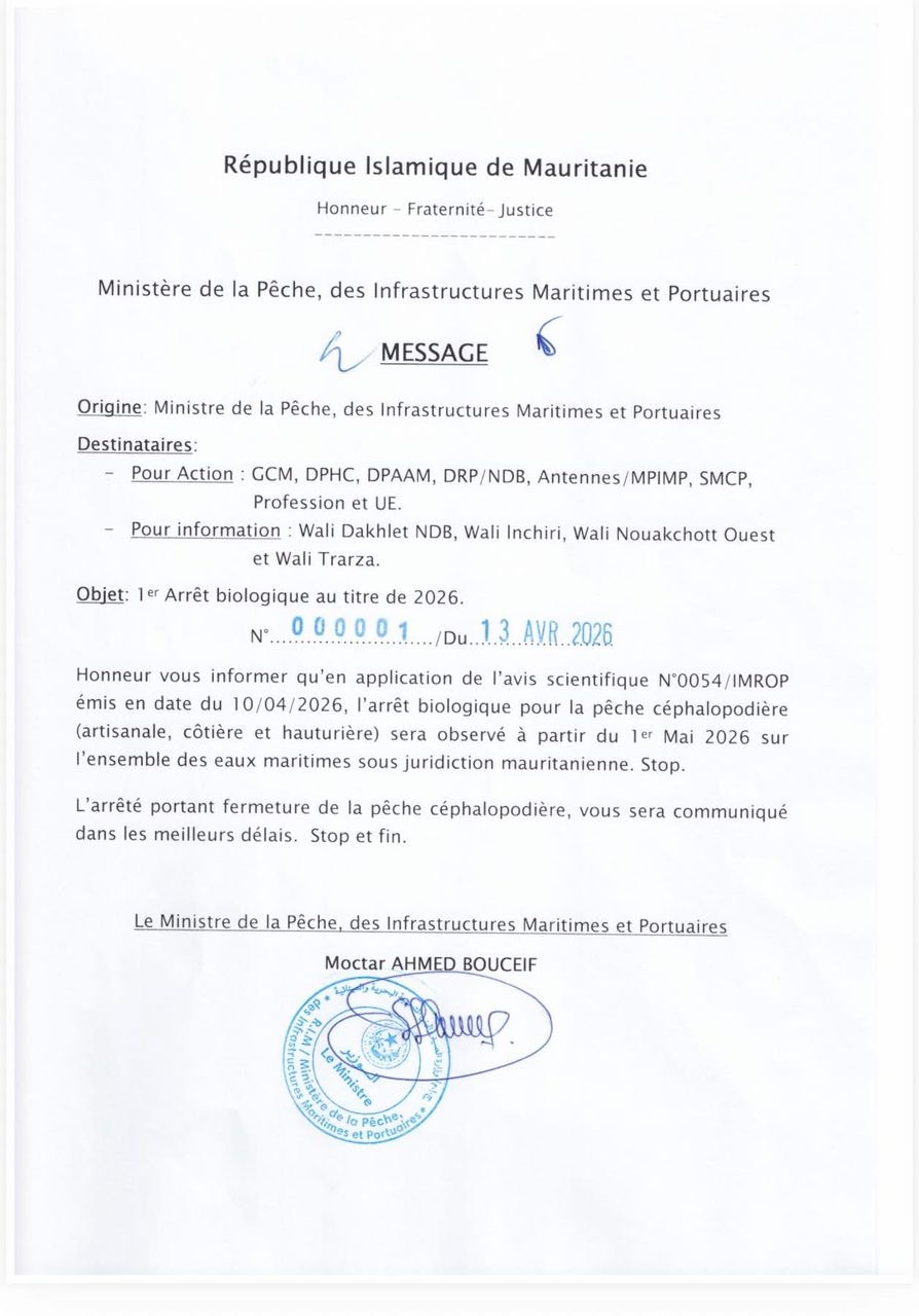 جاء ذلك في إعلان أصدرته اليوم، بينت خلاله أن القرار يأتي استنادا إلى توصيات علمية صادرة عن المعهد الموريتاني لبحوث المحيطات والصيد بتاريخ الـ10 من الشهر الجاري، بهدف ضمان تجدد المخزون السمكي والحفاظ على استدامة الموارد البحرية.