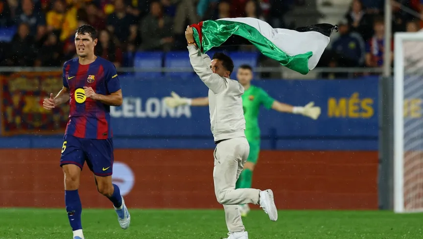 اقتحم مشجع يحمل علم فلسطين ملعب يوهان كرويف أثناء مباراة برشلونة مع خيتافي في الدوري الإسباني اليوم الأحد.
