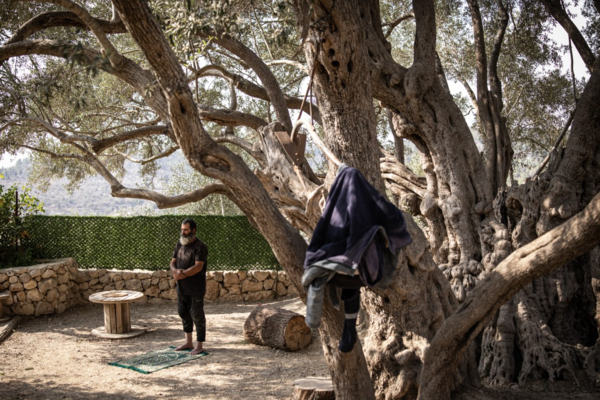 حول جذع الشجرة الضخم وفروعها الممتدة التي أطلق أبو علي على بعضها أسماء أفراد عائلته، يعمل أبو علي في ما يشبه واحة صغيرة هادئة.