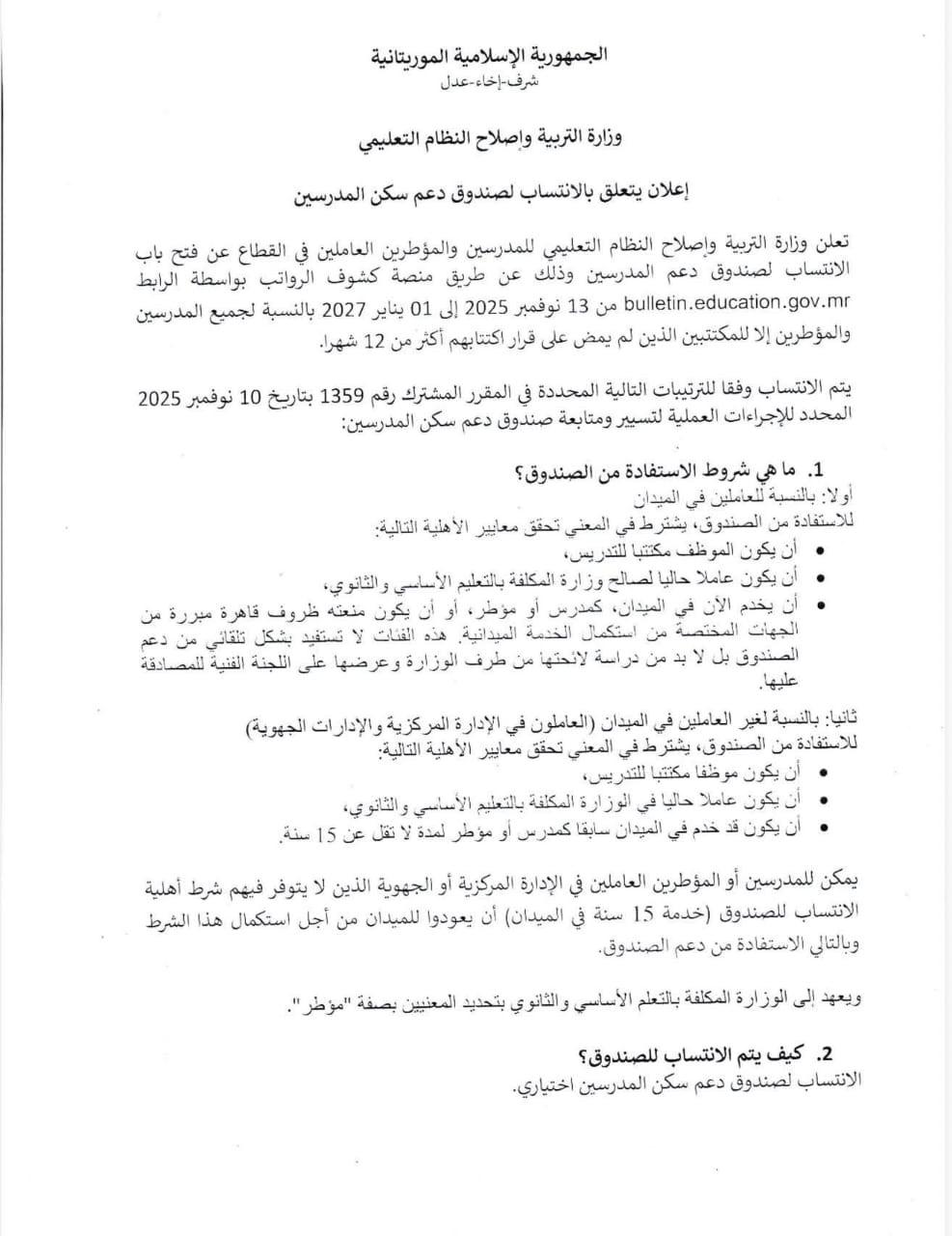 واشترطت الوزارة للاستفادة من الصندوق بالنسبة للميدانيين كون الموظف مكتتبا للتدريس، ويعمل حاليا لصالح الوزارة، إضافة لكونه يخدم حاليا بالميدان.