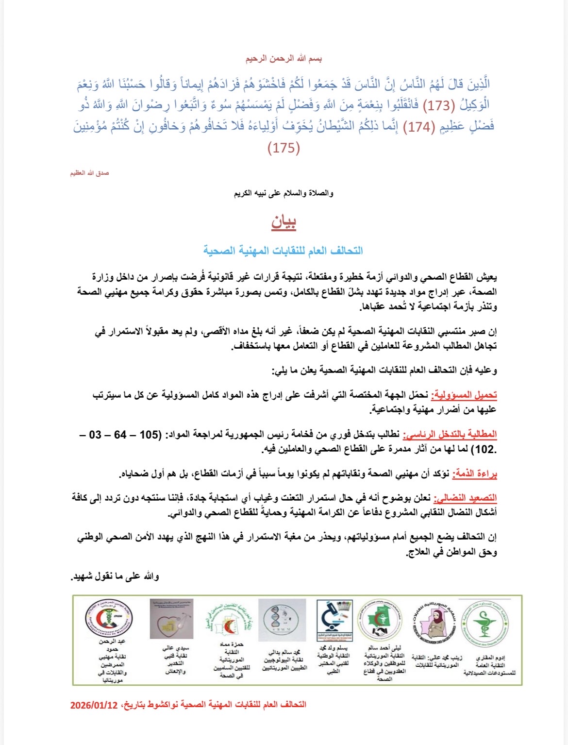 وطالب التحالف الرئيس محمد ولد الغزواني بمراجعة المواد: (03-64 - 105 - 102) لما لها من آثار مدمرة على القطاع الصحي والعاملين فيه.
